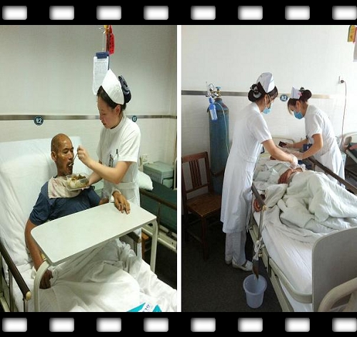 老人因颅内占位性病变导致失语,右侧肢体偏瘫,全身多处大面积擦伤及Ⅲ°压疮,生活完全不能自理,加之长期孤独和流离失所,生活中常常受到岐视和白眼,刚入院时表现出狂臊、胆小、多疑、不愿与人交流。神经内科医务人员在科主任﹑护士长的带领下,克服人员少、工作任务重的困难,为老人洗头、剪指甲、皮肤及口腔护理、打饭喂饭、协助大小便,还有护士从家中带来电动剃须刀,帮助老人剃须理发。终于,在医护人员的爱心仁术和精心呵护下,老人的病情得到有效控制,入院时带入的大面积擦伤及Ⅲ°压疮也已痊愈,面貌焕然一新,并重新燃起生的信心。