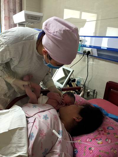 为避免各种风险,医院为产妇量身定制了应急预案,选派经验丰富的骨干助产士接生。在助产士的精心关照与耐心指导下,产妇一步步地自然进入分娩状态。为了帮助产妇顺利分娩,助产士们轻抚着产妇,不时进行心理疏导,并采用各种专业助产技巧,引导宝宝平安出生。