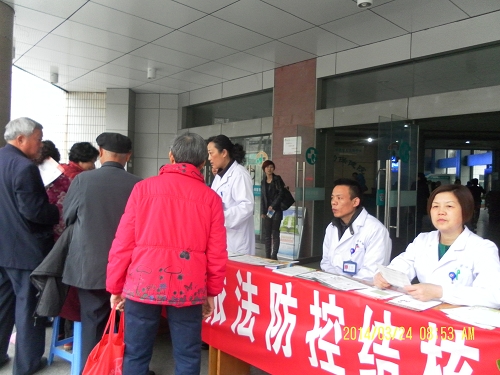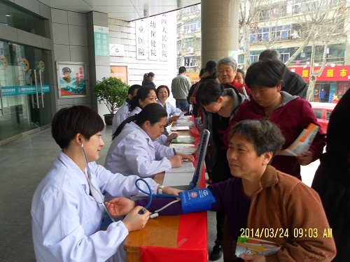 在门诊楼前开展主题义诊宣传活动,为过往群众测血压、健康咨询和指导规范就医合理用药。