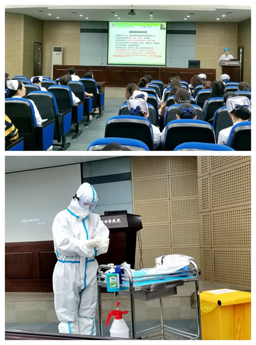 培训会首先由院感科主任施丽萍讲授医疗机构新冠肺炎疫情防控工作指引,包括医院感染防控总则、医务人员个人防护指引、清洁与消毒指引、医务人员职业暴露处置指引、新冠肺炎疑似或确诊死亡患者处置指引、过渡病房的管理、重点科室新冠肺炎疫情防控工作指引等;然后播放医务人员核酸采样防护用品穿脱流程视频,与会人员共同学习,同时邀请我院第一位支援武汉的心血管呼吸内科护师霍凌燕现场演示穿脱防护服的整个流程。