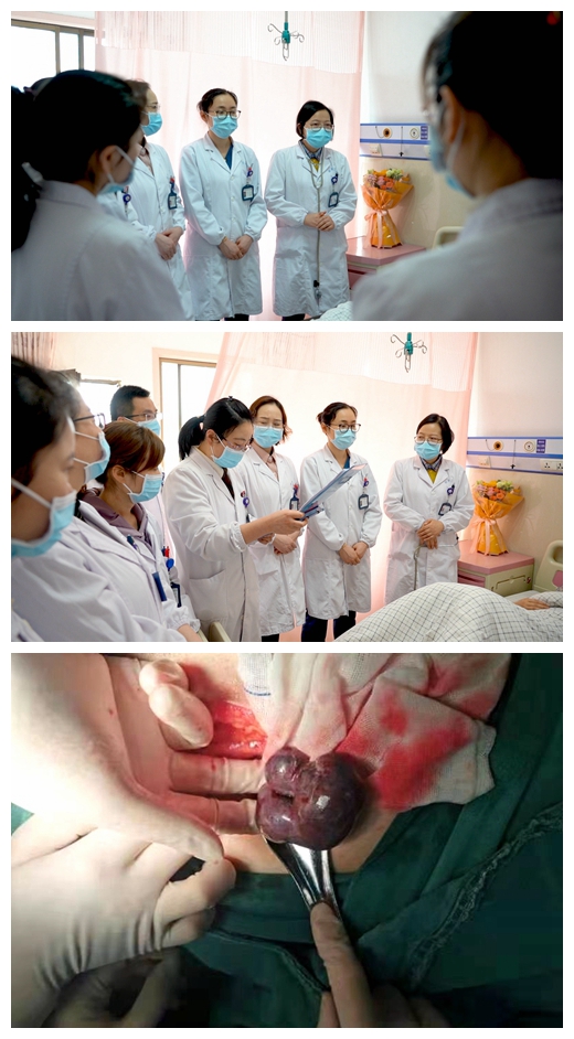 原来,30岁的王女士今年1月23日刚在上海市某医院行第二次胚胎移植术(试管婴儿)成功怀孕,回到铜陵后,3月17日22时突发右下腹胀痛,持续不缓解,伴有呕吐,辗转就诊市内多家医院却查不出病因,于3月18日晨6时急诊入住我院产科。产科王芬主任团队根据王女士既往有“输卵管积水”病史和生命体征特点,结合超声,考虑腹痛原因可能为“输卵管扭转”,立即予解痉止痛等对症处理,并作进一步鉴别诊断。3月19日下午,患者出现全下腹痛,伴腹胀、肛门坠胀,小便自解不畅,王女士及家属对胎儿有非常高的期望值,要求保住胎儿。当日晚10时,王女士体温升高达38.9℃,王芬主任立即组织多学科会诊,决定即刻行剖腹探查,并制定保胎方案。手术中,麻醉科主治医师蒋嫣采取了对胎儿危害最小的麻醉方案和麻醉用药,王芬主任团队轻柔操作,在王女士子宫右侧后方掏出增粗扭曲成团状发黑的输卵管,所幸右侧卵巢无异常,遂行病灶切除,手术顺利,仅历时25分钟。术后王女士恢复良好,更可喜的是3月24日产科B超提示王女士“胎儿相当于76天大小,胎心好”。