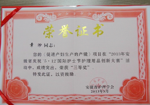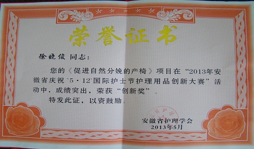 5月6日,在安徽省首届护士岗位创新技能大赛表彰大会上,来自铜陵市妇幼保健院的两名护理人员选送的《促进产妇分娩的产镜》和《促进自然分娩的产椅》分别荣获三等奖和创新奖,同时均获得国家知识产权局颁发的实用新型专利证书。