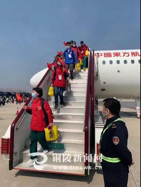 3月24日下午,圆满完成自己职责使命的铜陵第五批支援湖北医疗队乘坐包机归来。13时50分许,他们抵达合肥机场。