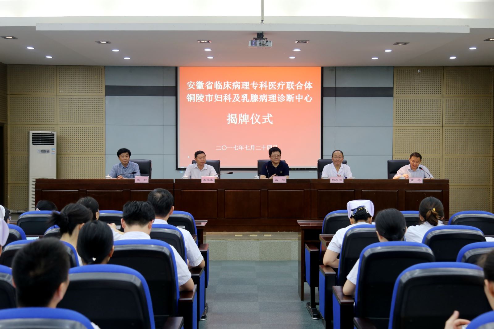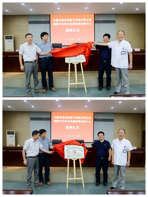 7月24日下午,安徽省临床病理专科医疗联合体——铜陵市妇科及乳腺病理诊断中心揭牌及启动仪式在铜陵市妇幼保健院(市第四人民医院)大会议室举行。中华病理学会常委、安徽省医学会病理分会主委、省病理质控中心主任孟刚教授、安徽省医学会病理分会副主委、省病理质控中心副主任陈柯教授、市卫计委党委副书记朱友生、市妇幼保健院院长杨志刚参加并揭牌。副院长章秀主持了仪式。