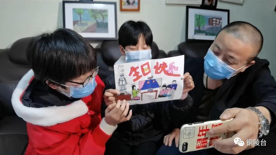 通过手机视频通讯,她的爱人宗卫和两个女儿一起拿出了特地为妈妈准备的生日蛋糕。女儿宗梓灵和宗梓晴介绍最近的学习情况、展示近期的画作,说着和妈妈说不完的话;宗卫说道,因为在防疫第一线,隔离服一穿就是好几个小时,爱人口罩下的脸庞有着深深的印痕,让他心疼。