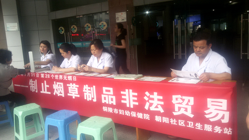 今年5月31日是第28个世界无烟日,为进一步做好控烟履约工作,市妇幼保健院健康教育科、朝阳社区卫生服务站在铜陵市妇幼保健院门诊开展义诊宣传活动。