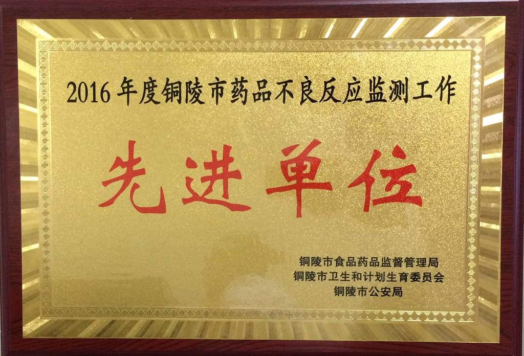 6月29日下午,在2017年铜陵市药械化及药物滥用监测工作会议上我院被市卫计委、市食品药品监督管理局、市公安局联合授予“2016年度铜陵市药品不良反应监测工作先进单位”荣誉称号。