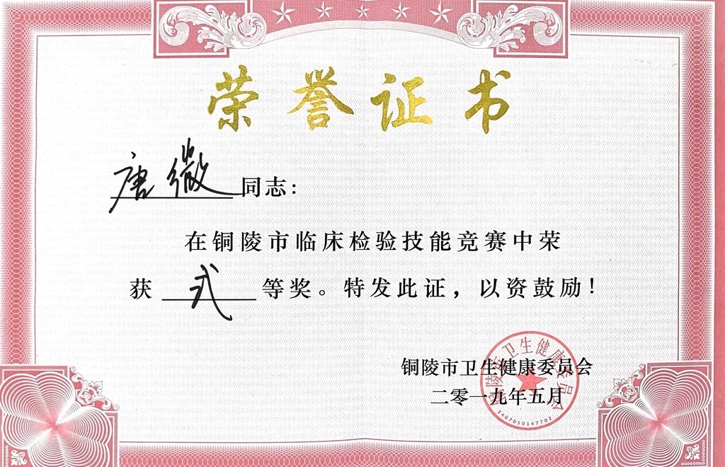 此次竞赛全以笔试形式进行,由专家组评委根据评分细则进行阅卷评分,按总分高低进行排名,对获得总分前10名选手,予以表彰。我院检验科唐微在此次竞赛中发挥出色荣获二等奖,为我院赢得了荣誉。