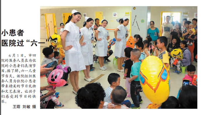 6月1日,市四院的医务人员在为住院的小患者们表演节目。据了解,六一儿童节当天,该院组织医务人员为住院小患者带来精美的节日礼物和文艺表演,让孩子们感受到节日的快乐。