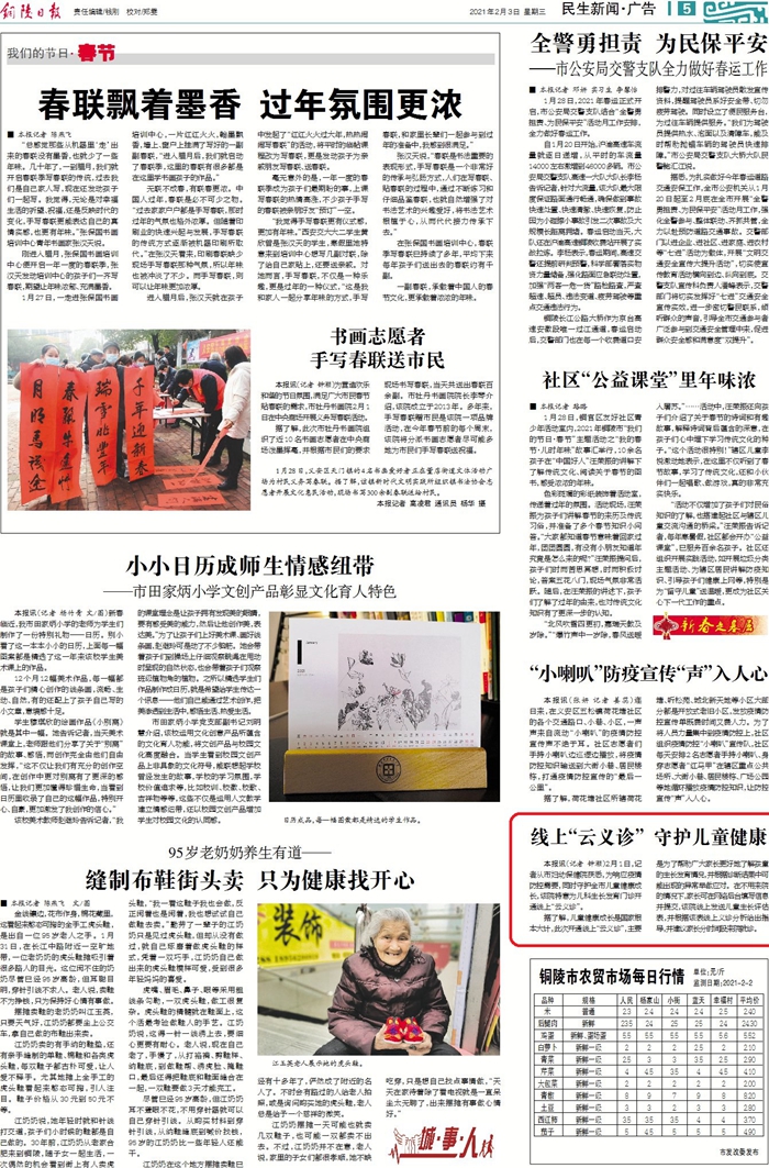 《铜陵日报》2021年2月3日 5版 2月1日,记者从市妇幼保健院获悉,为响应疫情防控需要,同时守护全市儿童健康成长,该院特意为儿科生长发育门诊开通线上“云义诊”。 据了解,儿童健康成长是国家根本大计,此次开通线上“云义诊”,主要是为了帮助广大家长更好地了解孩童的生长发育情况,并根据诊断结果中可能出现的异常早做应对。在不用来院的情况下,家长可在网络后台填写信息并提交,该院线上发送儿童生长评估表,并根据该表线上义诊分析给出指导,并建议家长分时间段来院就诊。