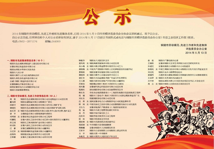 经59日市劳模评选委员会全体会议原则通过,2014年铜陵市劳动模范、先进工作者和先进集体名单于513日在《铜陵日报》予以公示,我院妇产科主任、副主任医师朱桃花榜上有名。