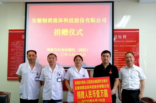 为庆祝第三个中国医师节,表达对医务人员的关心与支持,8月19日,安徽铜都流体科技股份有限公司(原安徽铜都阀门股份有限公司)向我院捐赠壹万元慰问金,市纪委监委驻市卫健委纪检监察组组长胡大强、院党委书记於凤霞、院长章秀、院纪委书记张德明出席了捐赠仪式。