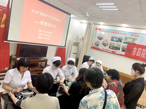 为深入开展好党史教育,传承红色基因,弘扬时代精神,在“5.12”国际护士节来临之际,我院组织多名医疗、保健专家和护士到朝阳社区开展以“学党史、悟思想、办实事、强服务--健康进社区”为主题的志愿服务活动,为社区居民讲授乳腺健康知识,免费为居民测血压、测血糖,发放宣传资料,并现场对居民们提出的健康问题进行答疑。