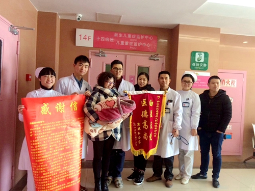 熊女士之子于孕34周出生,生后因呼吸困难、气促、呻吟伴皮肤发绀急送儿科NICU救治,诊断为“早产儿”、“新生儿呼吸窘迫综合征”,入科即予以无创呼吸机供氧、重症监护等积极抢救,经儿科专家团队和NICU医护人员11天的精心治疗和护理,于元月19日康复出院。