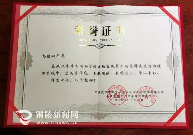 他们所在的安徽省第五批医疗队获得全省卫生健康系统新冠肺炎疫情防控工作先进集体推荐、获得团中央“青年逆行者突击队”推荐,铜陵6人均获得中共武汉市体校临时委员会、武汉市体校方舱医院颁发的抗击新冠肺炎疫情防控“优秀医护工作者”荣誉奖章。