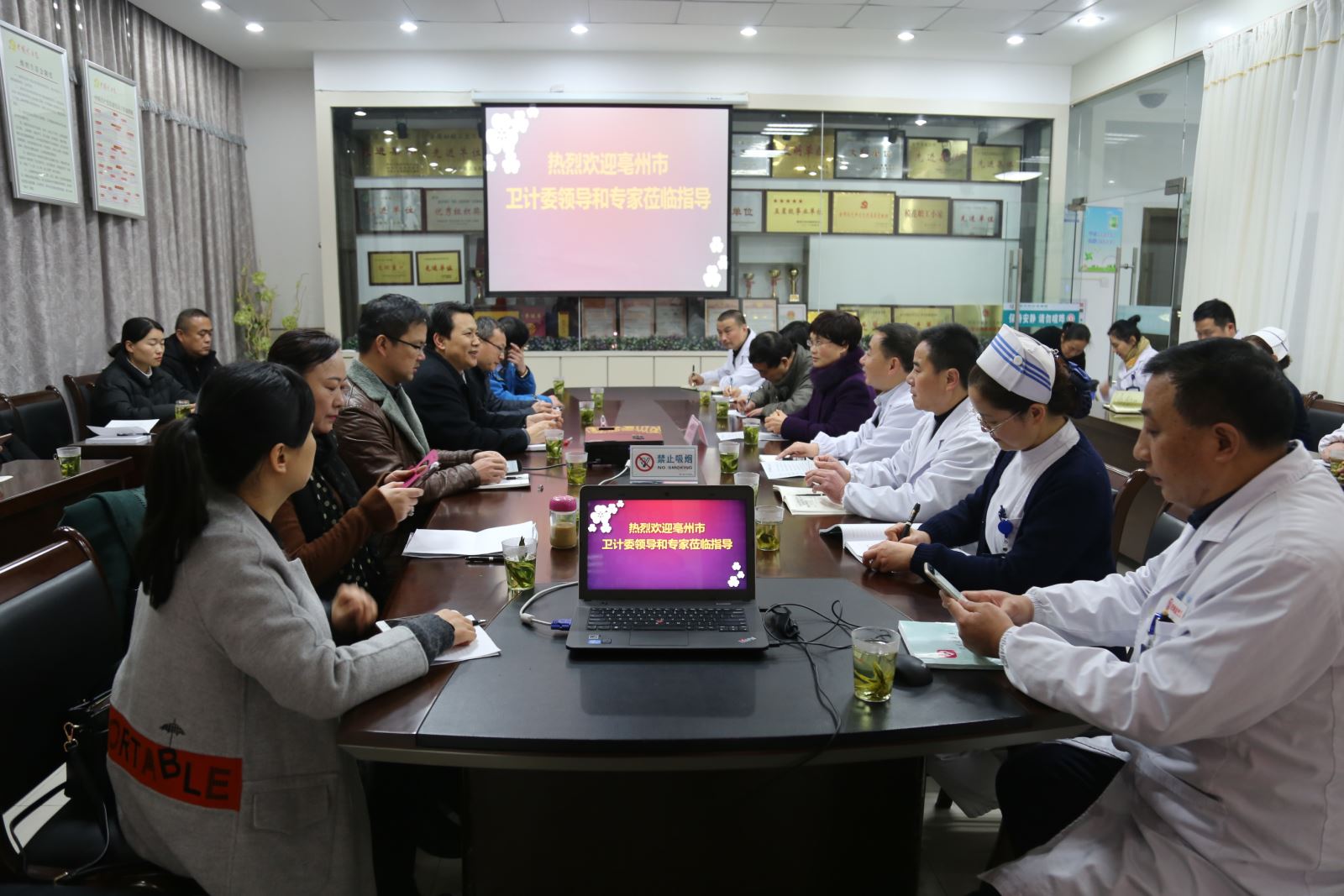 期间,亳州市卫计委丁副主任介绍了亳州市医疗机构的情况,此行前来学习创建健康促进医院经验,为创建工作开拓思路。市卫计委马勇荣副主任及我院领导对亳州市卫生系统同仁的到来表示欢迎。院长助理张德明就我院健康促进医院创建的经验与做法做了详细的介绍。