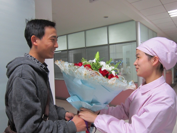 11月17日上午10时许,一位小伙子手捧一束玫瑰花来到我院产房,要将花儿送给在这里上班的张铭。一开始,在场的医务人员以为是年轻人的浪漫,然而一打听,原来小伙子是张铭导乐分娩产妇的家属,特意送来鲜花以感谢张铭对他爱人的悉心照顾。这令助产士张铭十分感动,因为自己的服务得到了产妇的肯定,此刻收获的不仅仅是一束鲜花,更是一份鼓励,一份对护理事业执着追求的信心。