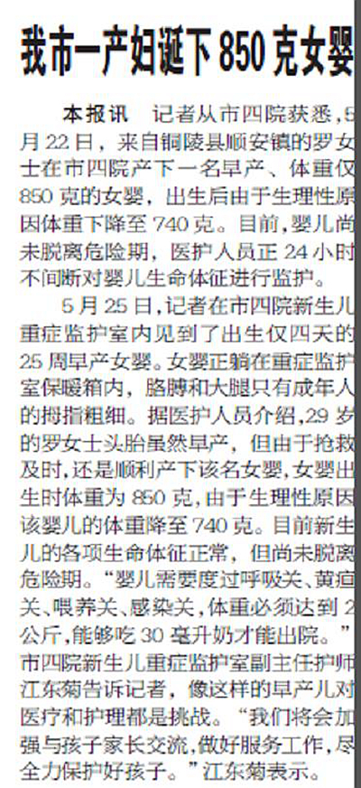 5月25日,记者在市四院新生儿重症监护室内见到了出生仅四天的25周早产女婴。女婴正躺在重症监护室保暖箱内,胳膊和大腿只有成年人的拇指粗细。据医护人员介绍,29岁的罗女士头胎虽然早产,但由于抢救及时,还是顺利产下该名女婴,女婴出生时体重为850克,由于生理性原因该婴儿的体重降至740克。目前新生儿的各项生命体征正常,但尚未脱离危险期。“婴儿需要度过呼吸关、黄疸关、喂养关、感染关,体重必须达到2公斤,能够吃30毫升奶才能出院。”市四院新生儿重症监护室副主任护师江东菊告诉记者,像这样的早产儿对医疗和护理都是挑战。“我们将会加强与孩子家长交流,做好服务工作,尽全力保护好孩子。”江东菊表示。