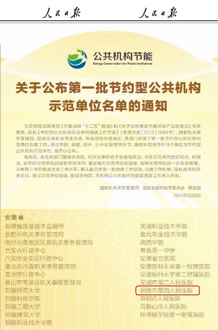 日前,国家机关事务管理局、发展改革委、财政部在《人民日报》公布了第一批879家节约型公共机构示范单位名单,市第四人民医院名列其中,我市仅两家。