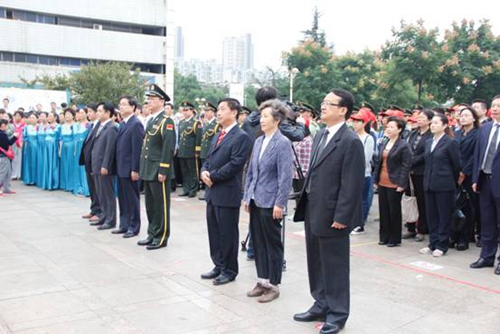 各级领导凝视徐徐上升的五星红旗