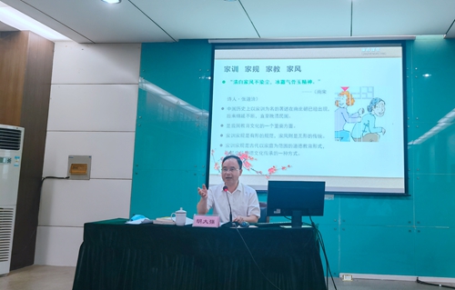 胡大强以《家风不染尘 幸福传家久》为题,从家训家规家教家风、历史上的家训家规、家训家规家风的功能和作用、古代家训家规的主要内容、家是最小国国是千万家、弘扬家风重视家教的当代价值、家风不正遗祸患、国风之本在家风、家风建设的新时代和党员干部之家该有怎样的家风等十个方面深刻阐述了“优良家风”这一中华优秀传统文化对个人、家庭和国家的重要性,强调党员干部要清廉自守,不为利益所动;管好身边人,不插手公事;立好家规,当好家长;率先示范,以形成良好的党风政风民风和社会道德风尚。