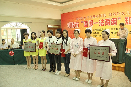 5月20日上午,由市妇儿工委主办,市妇联、市综治办、市司法局、市广播电视台承办的“国策一法两纲”知识电视大赛在市妇女儿童活动中心举行。市人大常委会副主任朱家祥、市政协副主席吴少文出席活动并为获奖队伍颁奖。