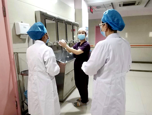 医务人员默默记着洗手口诀:“内、外、夹、弓、大、立”,认真完成着“六步洗手法”。