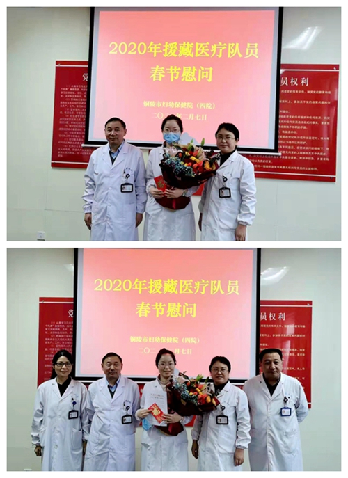 在2021年新春佳节即将来临之际,2月7日上午,院党委书记於凤霞,院党委委员、院长章秀,院党委委员、纪委书记张德明,院工会主席王晓平,亲切看望慰问我院援藏医疗队员魏义婷同志,向她送上新春祝福。