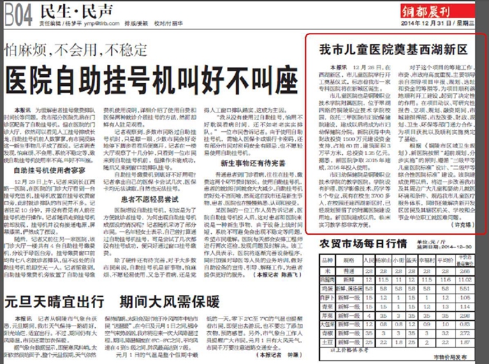 12月26日,在西湖新区,市儿童医院举行开工奠基仪式,标志着我市一家专科医院将在新城区诞生。
