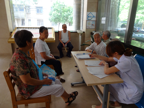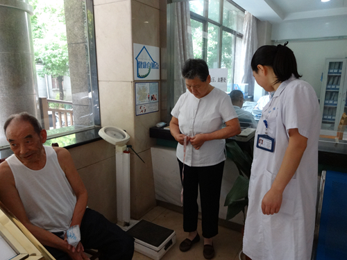 7月14日上午,在朝阳社区卫生服务中心“健康自测点”,慢病自我管理小组成员正在医务人员的指导下进行自我检测身高、体重、腰围、腹围。据参加活动的老人介绍,他是自愿参加慢病自我管理小组的,各项活动的开展对其养成良好的生活习惯、增强慢性病的预防意识、做好自我管理有实际作用,希望今后定期开展此类活动。