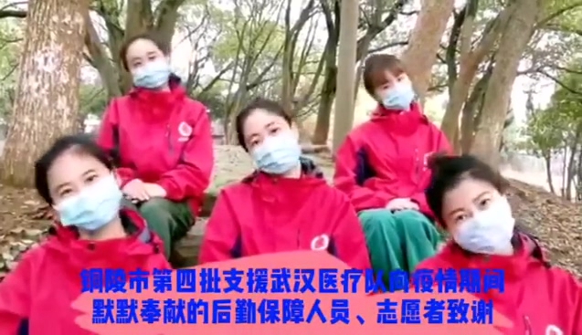 3月22日下午,铜陵市第四批(安徽省第五批)支援湖北医疗队6名队员在定点休养场所拍下了这段视频,用自己的肢体语言向关心关爱他们的人致敬。 这6名队员于3月18日胜利凯旋,现在定点集中休养。这群最美逆行人,不但在武汉圆满完成了自己的使命任务,还对所有关心他们、服务他们的志愿者以及后勤保障人员心怀感恩。这段视频配上温馨的音乐,让人觉得格外暖心,如沐春风。
