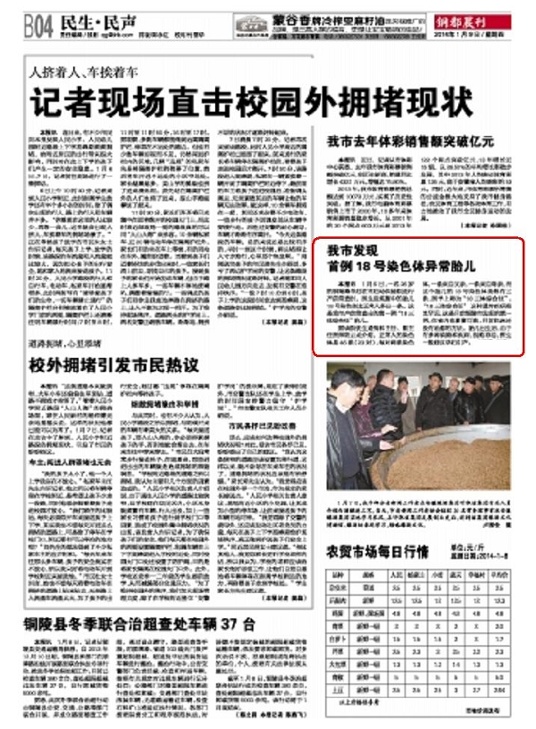 本报讯 1月6日,一名26岁的铜陵籍孕妇在市妇幼保健院进行产前筛查时,医生发现腹中的胎儿18号染色体比正常人多出一条。这是我市产前筛查出的第一例“18三体综合征”胎儿。 据该院优生遗传科主任、副主任医师陆云龙介绍,正常人的染色体是46条(23对),每对两条染色体,一条来自父亲,一条来自母亲,而这个胎儿的18号染色体竟然有三条,医学上称为“18三体综合征”。“18三体综合征”这种遗传疾病极其罕见,这是目前铜陵市发现的第一例,在省内也寥寥可数,目前临床还没有治愈的方法。胎儿出生后,由于有多种缺陷和疾病,很难存活,医生一般建议孕妇引产。
