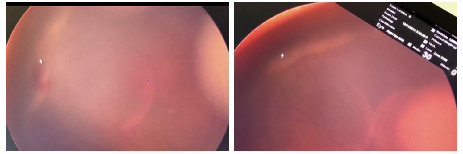 近期我院眼科在新生儿眼底疾病筛查工作中发现两例足月新生儿眼底视网膜血管发育异常、渗出性改变连接成片且超过五个钟点位,并有新生血管形成。经专家会诊确诊为“家族性渗出性玻璃体视网膜病变”(FEVR)。