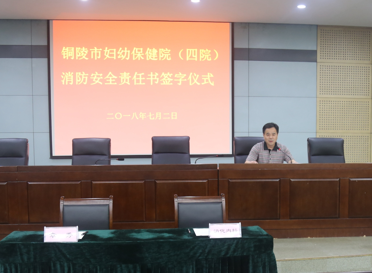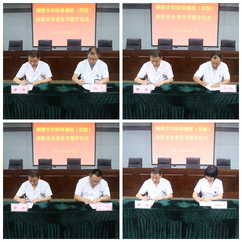 为加强医院消防安全管理,确保患者及医务人员的人身及财产安全,7月2日下午,市妇幼保健院(四院)在门诊楼七楼第一会议室举行了2018年消防安全责任书签字仪式。院领导班子成员、全体中层干部参加了仪式,仪式由副院长国小满主持,院主要负责人章秀与重点科室负责人分别签订了消防安全责任书。