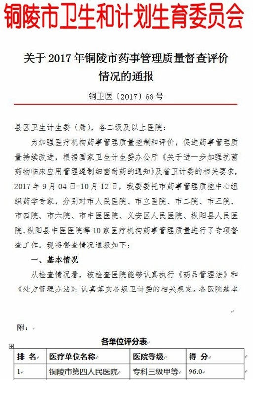为加强医疗机构药事管理质量控制和评价,促进药事管理质量持续改进,市卫计委药事管理质控中心组织药学专家,分别对我市10家二级以上医院药事管理质量进行了专项督查,我院获得总分96分,综合排名全市第一。 我院药学部将进一步加强抗菌药物的临床合理运用和药学服务监护工作,明确医院药事管理组织职责,加强药品监管,提升合理用药水平,保证患者用药安全。
