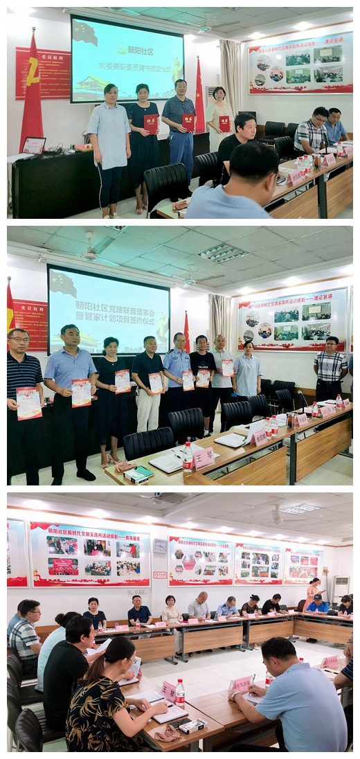 8月11日上午,铜官区朝阳社区召开党建联盟理事会暨管家计划项目集中签约仪式,社区党委班子成员、党建联盟成员单位党组织负责人、市区结对联系单位和项目实施团队负责人参加了会议。 会议集中学习了《习近平谈治国理政》第三卷文章《新时代党的建设和党的组织路线》,之后,朝阳社区党委书记朱迪音介绍了社区党建工作开展情况,与会人员也就推深做实党建联盟工作进行了交流发言。 会上,朝阳社区党委还向殷贵霞等兼职委员颁发了聘书,向参与疫情防控的党建联盟成员单位发放了感谢信。