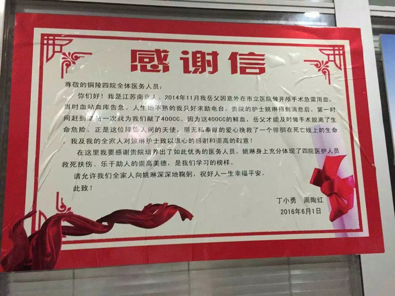 2016年6月1日下午,一张金灿灿的感谢信送到铜陵市妇幼保健院产房,感谢产房护士姚琳在危机时刻无私奉献,挽救了一名挣扎在死亡线上的老人,亲切地称她为“降临人间的天使”!
