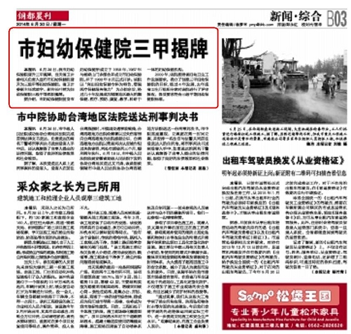 6月28日,我市妇幼保健院晋升三甲揭牌,当天省卫计委相关负责人宣布市妇幼保健院晋升为三级甲等妇幼保健院。省卫计委副主任武琼宇、副市长叶萍为妇幼保健院三级甲等医院揭牌。