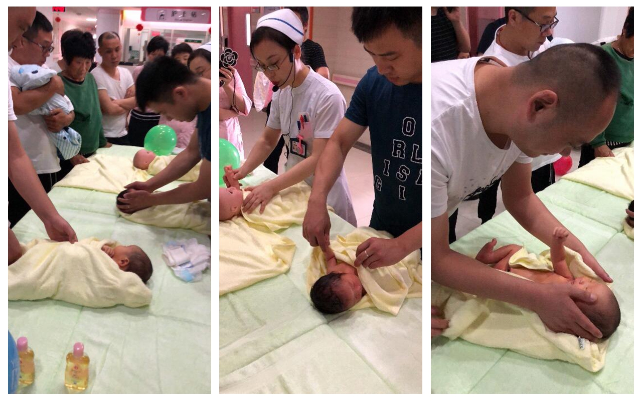 在妇产科朱主任和六病区护士长的组织下,科室组织了“爸爸在哪儿”的活动,让爸爸们亲自给宝宝们做按摩抚触。看着平时粗犷的爸爸们,今日显得格外的细腻,他们眼神中透露出了深深的爱意,那双手在孩子的身上温柔的给孩子进行触摸,宝贝们似乎感受到了爸爸的关爱,都乖乖的躺着……