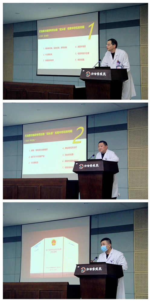 会上,神经内科主任王光曙和心肺内科主任李全贵分别就参加市卫健委、医保局等多部门组织的“打击欺诈骗保”回头看活动中专家督导意见向与会人员详细作了介绍,提示各相关业务科室作好规范管理。