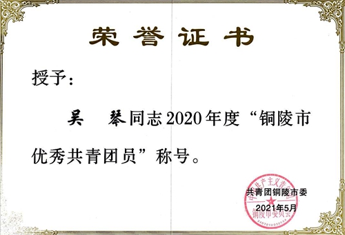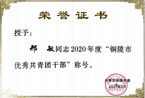 近日,共青团铜陵市委对2020年度全市共青团先进集体和个人进行了表彰。我院邢敏同志荣获“铜陵市优秀共青团干部”,吴琴同志荣获“铜陵市优秀共青团员”光荣称号。