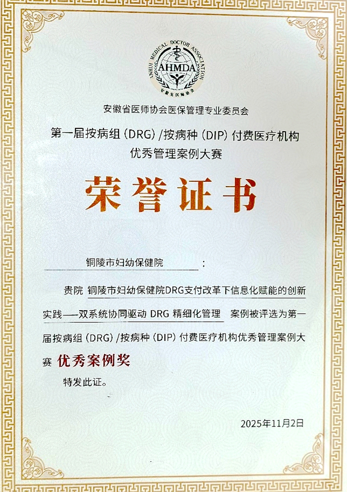 近日,铜陵市妇幼保健院在安徽省医师协会医保管理专委会第一届 DRG/DIP 付费优秀管理案例大赛中荣获优秀案例奖!