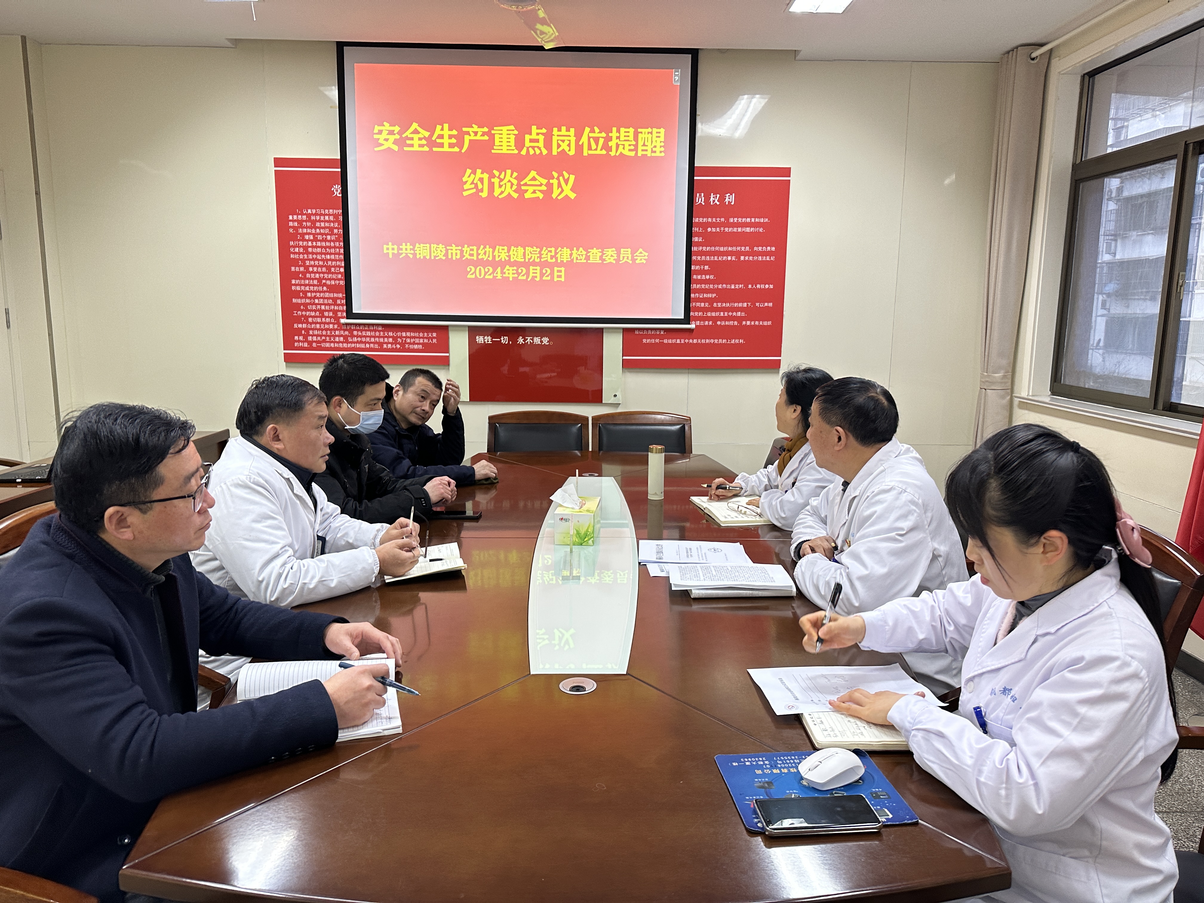 2月2日上午院纪委对总务科、信息科、药学部及金口岭社区卫生服务中心的负责人进行了关于安全生产的约谈,传达了省卫健委《关于立即开展安全生产风险隐患排查整治的通知》(皖卫传﹝2024﹞17号)、市卫健委《关于印发全市卫健系统安全生产“百日护安行动方案的通知”》(铜卫办﹝2024﹞5号)和驻市卫健委纪检组“关于安全生产责任制监督检查的通知”要求。强调了安全生产的重要性,并要求重点部门务必完善各部门的安全管理制度、应急预案。各岗位人员切实履行安全职责,加强日常安全管理和隐患排查工作。