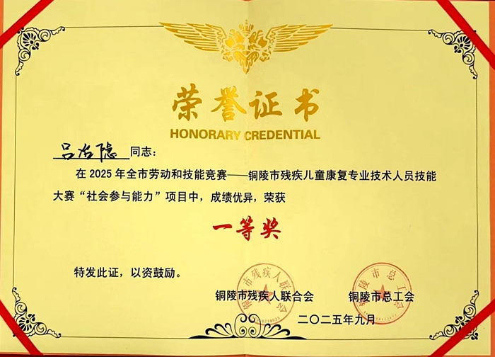 大赛聚焦残疾儿童康复实际需求,设立运动与感知觉、言语语言、社会参与能力三大竞赛项目。来自全市10家残疾儿童康复救助定点机构的50名康复专业技术人员,经过理论考试和技能实操两个环节的比拼,最终,我院吕冶隐获得社会参与能力项目个人一等奖,刘东获得运动与感知觉项目二等奖,秦景获得言语语言项目二等奖,我院获得团体一等奖。