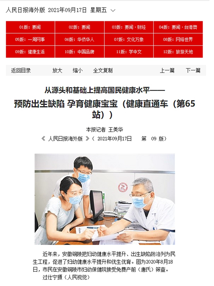 近年来,安徽铜陵把妇幼健康水平提升、出生缺陷防治列为民生工程,促进了妇幼健康水平提升和优生优育。图为市民在安徽铜陵市妇幼保健院接受免费产前(唐氏)筛查。 预防出生缺陷 孕育健康宝宝 20210917《人民日报(海外版)》.pdf