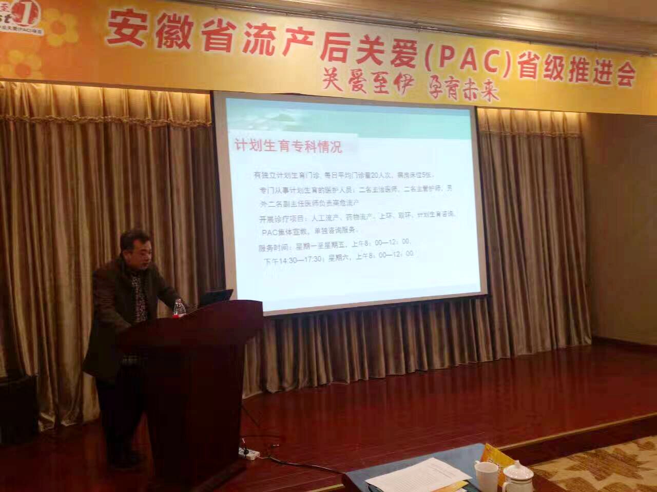 2016年12月4日安徽省流产关爱(PAC)省级推进会在合肥召开,本次会议由安徽省政府妇女儿童工作委员会举办,参加单位为中国妇女发展基金会、伊爱基金、安徽省卫计委、全省PAC优质服务医院和正在开展PAC项目医院。我院刘山主任作为PAC优质服务医院代表,在推进会上做PAC项目建设经验分享交流。